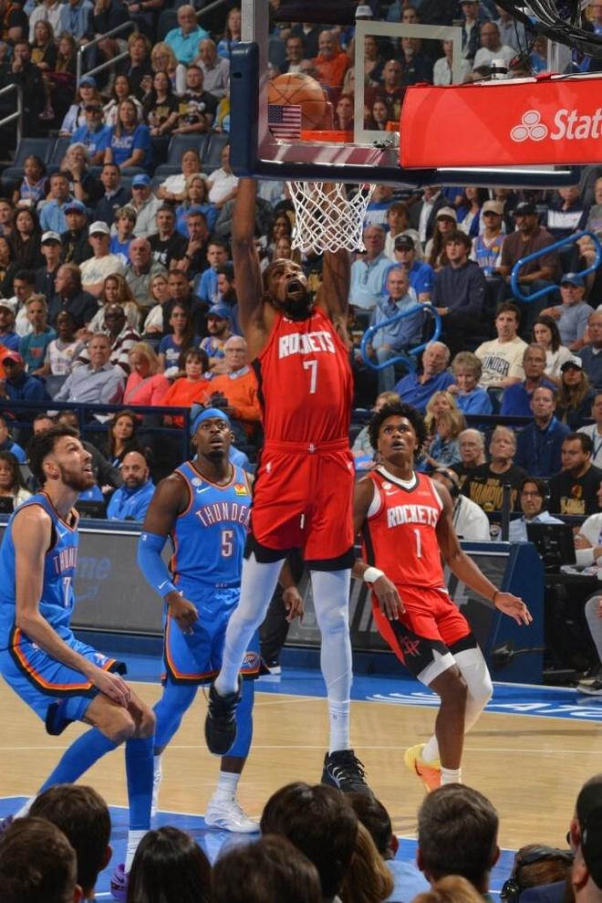揭幕戰(zhàn),火箭隊(duì)經(jīng)過雙加時(shí)以124-125不敵衛(wèi)冕冠軍雷霆隊(duì)。杜蘭特此役貢獻(xiàn)23分、9個(gè)籃板和3次助攻,卻在全場觀眾的歡呼聲中六犯離場。